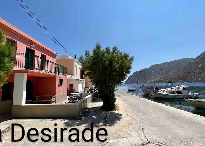 La DESIRADE Villa ligt op afstand van 2 km tot Windmills of Symi en nodigt gasten uit om te ontspannen op een terras.